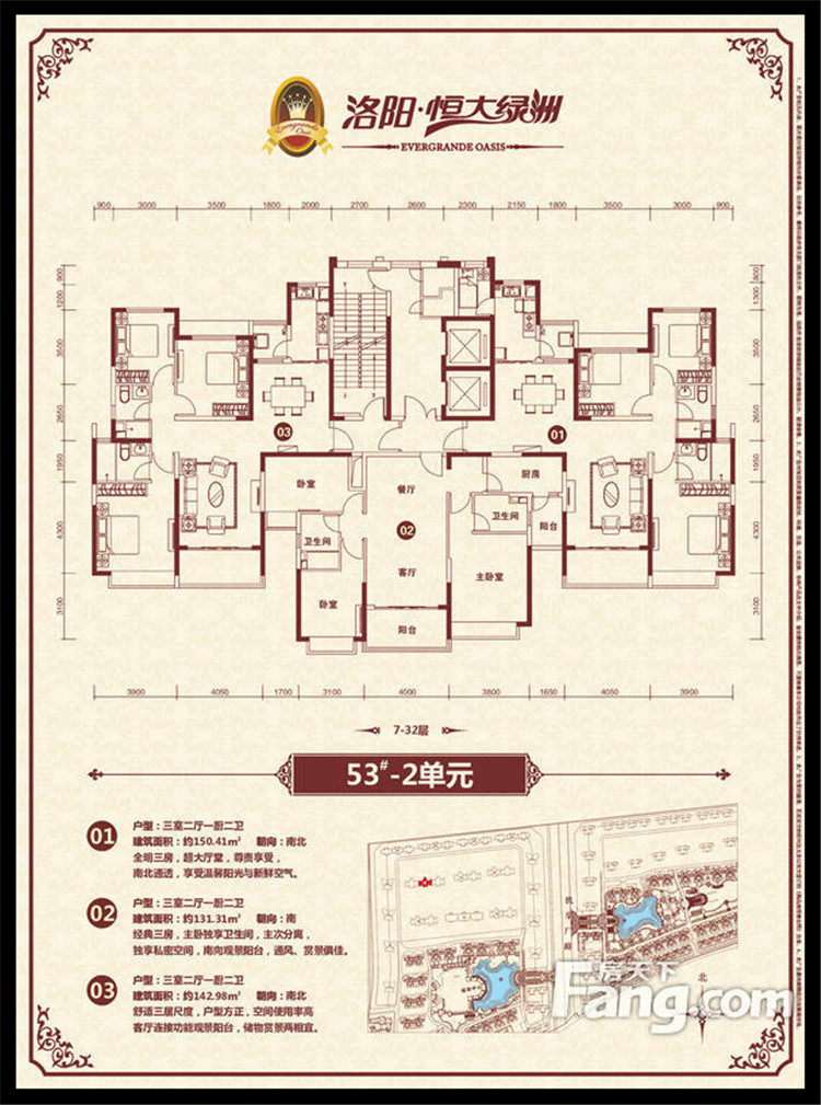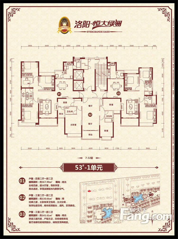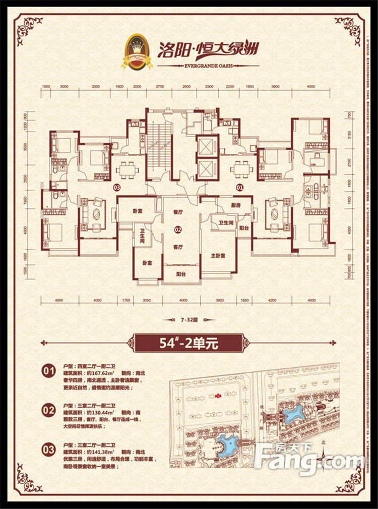 恒大綠洲項目位于洛陽市瀍河區洛陽市東出口,洛河以北、中州東路兩側、二廣高速以西,項目獨享洛河北岸3500多米河岸線,且處于洛陽市城市東西中軸線中州路東段,臨中州路街面長2000余米,有多路公交車直達。恒大綠洲全部項目占地面積約1338畝,規劃建筑面積近301萬平方米,居住單位2.06萬余戶,除居住建筑外,項目內還配置了運動中心、綜合樓(會所)、幼兒園、小學、中學、商業配套、五星級酒店等,整個項目建成后,將形成約6.6萬人的居住規模。全部項目累計總投資超過100億元人民幣,預計上交稅收超過15億元人民幣。