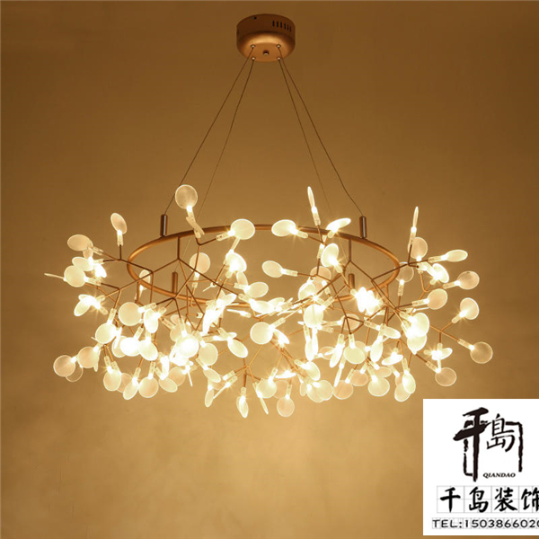 北歐現代風格的LED燈具設置了若干 “白色葉子/鏡片”,像一個分叉的樹枝,其形態兼具技術性和自然美感。在夜晚開燈的時候猶如一群螢火蟲飛舞,浪漫而且溫馨。