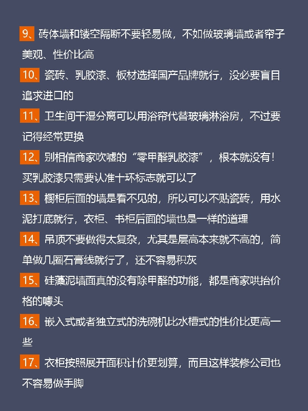 以上的一些容易被忽略的項目,是裝修公司zui經(jīng)常故意遺漏的,一開始不告訴你要做,等施工時才告訴你,然后分析完各種利弊之后就一個目的:額外收費,做!
