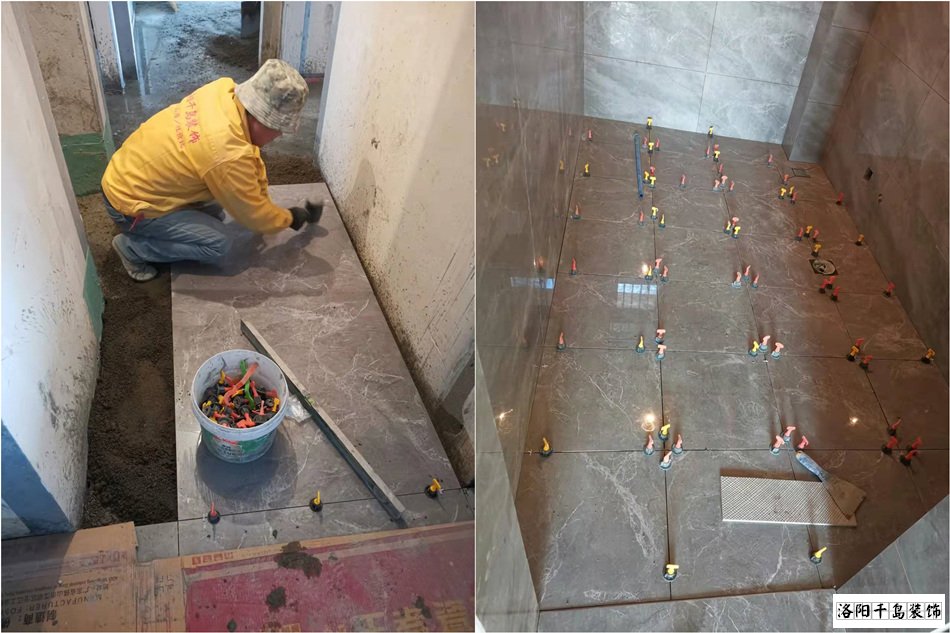 第七步、廚衛瓷磚完成之后,鋪貼大地磚,大地磚鋪貼也有兩種工藝。一種是水泥澆漿法,一種是背涂灰。