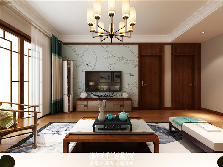 本案例僅過(guò)道位置設(shè)計(jì)了吊頂,客廳采用疊級(jí)石膏板結(jié)合石膏線,沒(méi)有過(guò)多繁瑣的設(shè)計(jì)。電視墻位置較小,通過(guò)線條造型,將臥室門(mén)融入電視墻中,整體大氣美觀。整體色調(diào)素雅,搭配新中式實(shí)木家具,韻味十足。