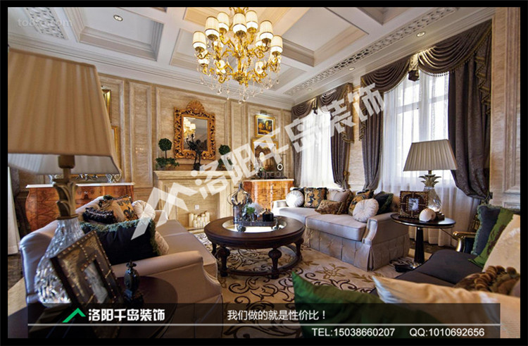 線條簡潔的歐式沙發展現現代風格,高貴、典雅又不失去浪漫氣質,復古的水晶燈,獨特的客廳屋頂鏤空設計,加上經典歐式拱形窗簾,從視覺上就俘虜了你。