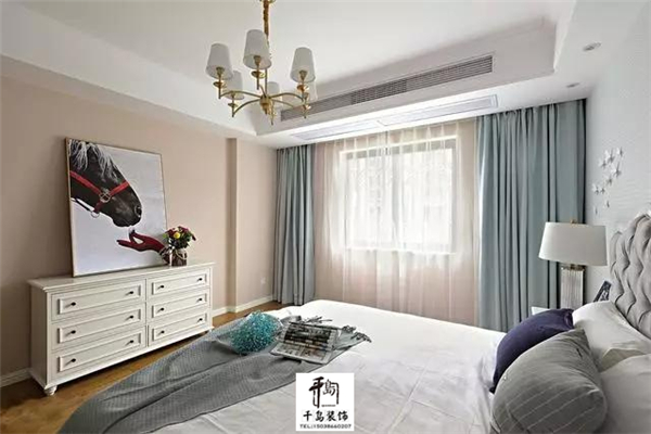 主臥的設(shè)計繼續(xù)延續(xù)素雅,這樣的睡眠空間更好的入睡。馬頭的裝飾畫為空間營造出一份藝術(shù)的氛圍。