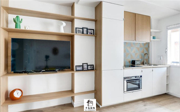 單獨(dú)的看一下這面墻,我覺得這人能夠利用墻壁裝出這樣的效果,也真是夠有才,這面墻壁不僅是電視墻,也是打造了入墻式的櫥柜,中間做了一個(gè)隔斷設(shè)計(jì),小小的櫥柜確是我們的開放式廚房,對于這種小戶型而言,這樣的設(shè)計(jì)很省空間,而且格局設(shè)計(jì)我覺得給滿分。