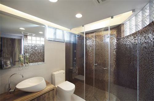 浴室用馬賽克裝飾一整塊墻壁,可能是一種比較奢華的感受。當(dāng)然,馬賽克只是一種裝飾的技巧,我們可以在電視機的背景墻中增添一橫條,類似于銀鏡的裝修,能起到很好的裝飾效果。