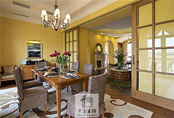 大家都知道黃色是有助于增加食欲的色彩,所以餐廳就更應該選擇一些偏黃色的色彩,帶給人暖意融融的氣氛,黑白搭配的吊燈,則能展現美式風情,打造餐廳的混搭風。