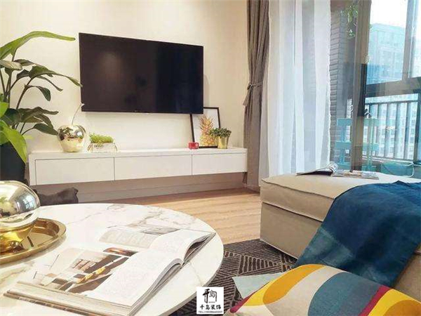 與傳統的落地電視柜不同,這里設計了懸掛式的白色電視柜,簡約時尚,重要的還實用,旁邊的綠植很搶眼,給家里營造出一個很清新的氛圍;