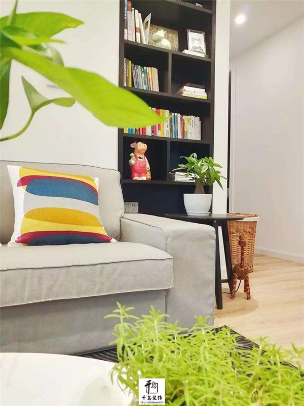 沙發墻即是在沙發的旁邊,做了一個嵌入式的壁柜,黑色的層板與白色的墻面形成一個視覺上的對比,看起來更有層次,重要的是也增加了家里的儲物需求;